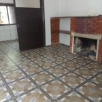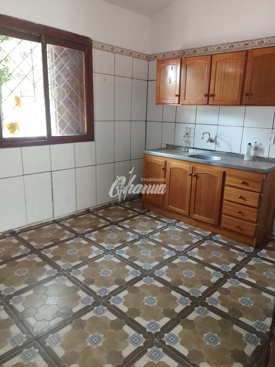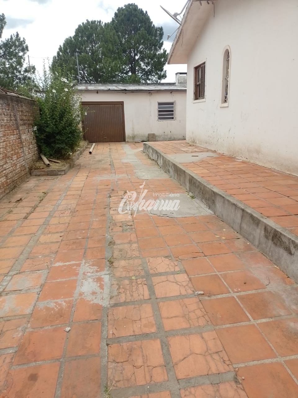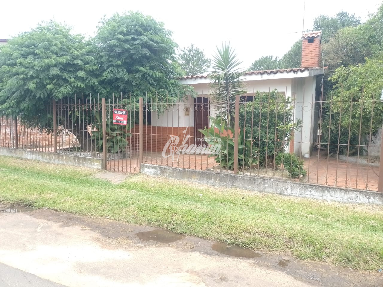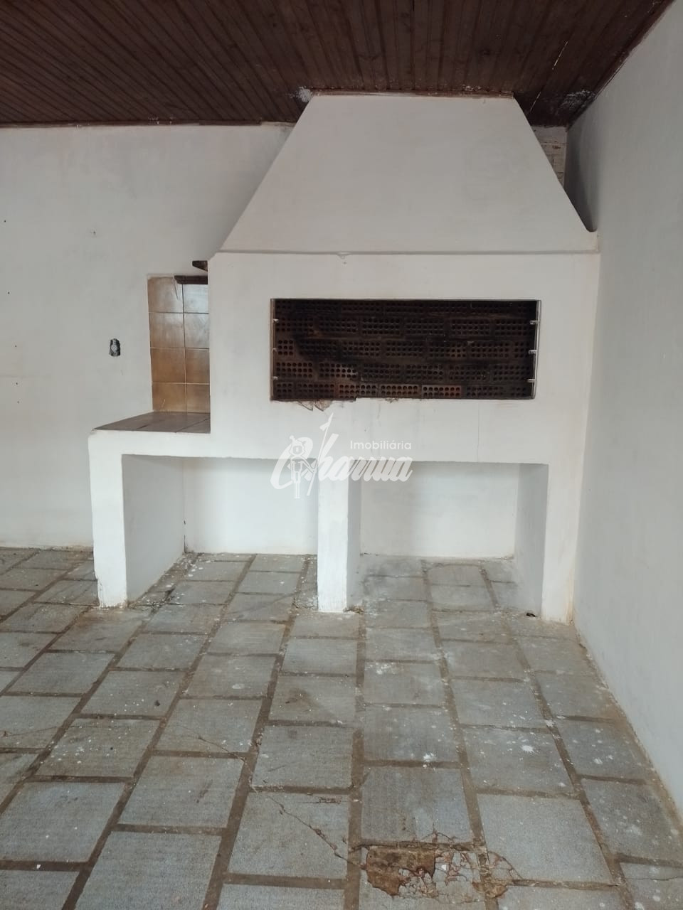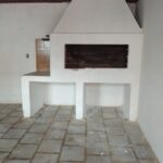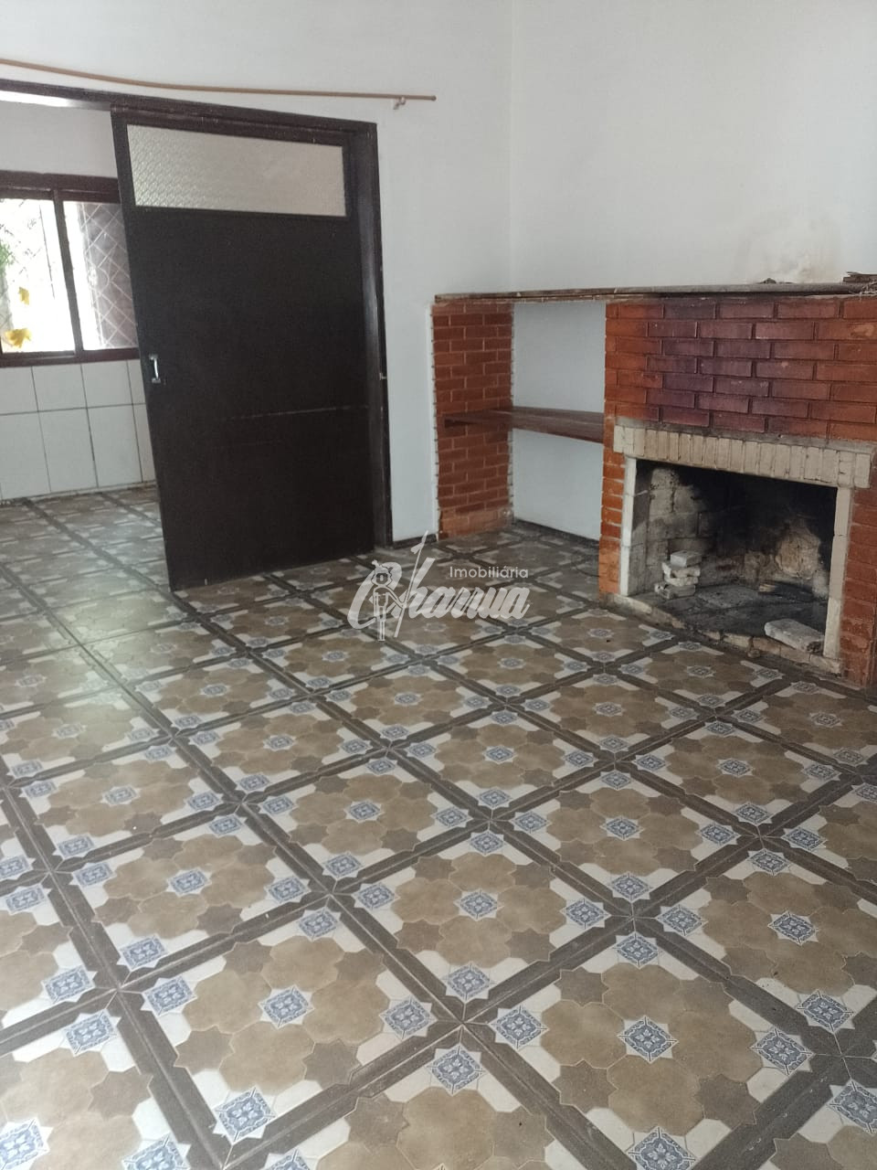 Casa com sala com lareira, dois dormitórios, banheiro social, cozinha, garagem com churrasqueira, banheiro de serviço, despensa e pátio.
