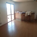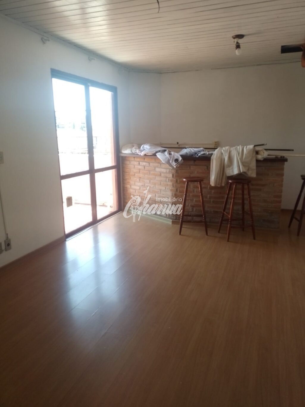 Apartamento com sala e cozinha conjugadas, um dormitório, banheiro e pátio.