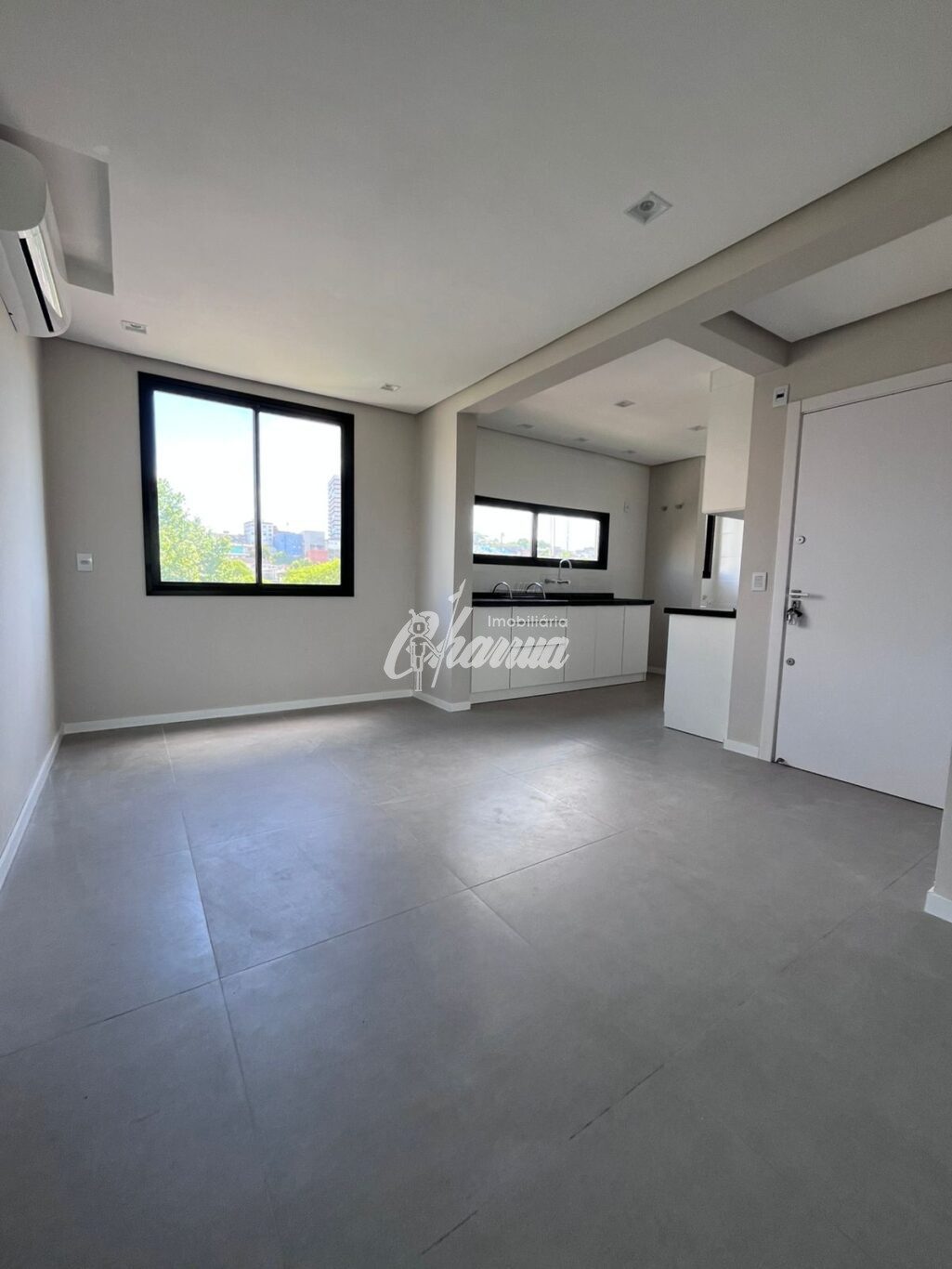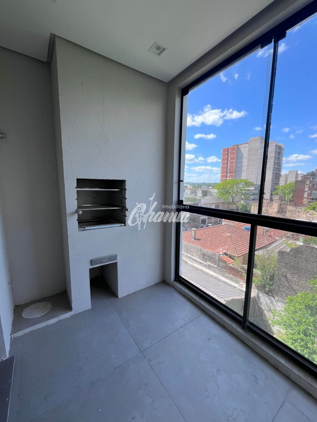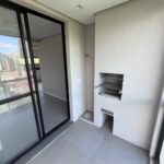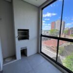 Apartamento com sala com sacada e churrasqueira, três dormitórios sendo uma suíte, banheiro social, cozinha, área de serviço e box para carro.