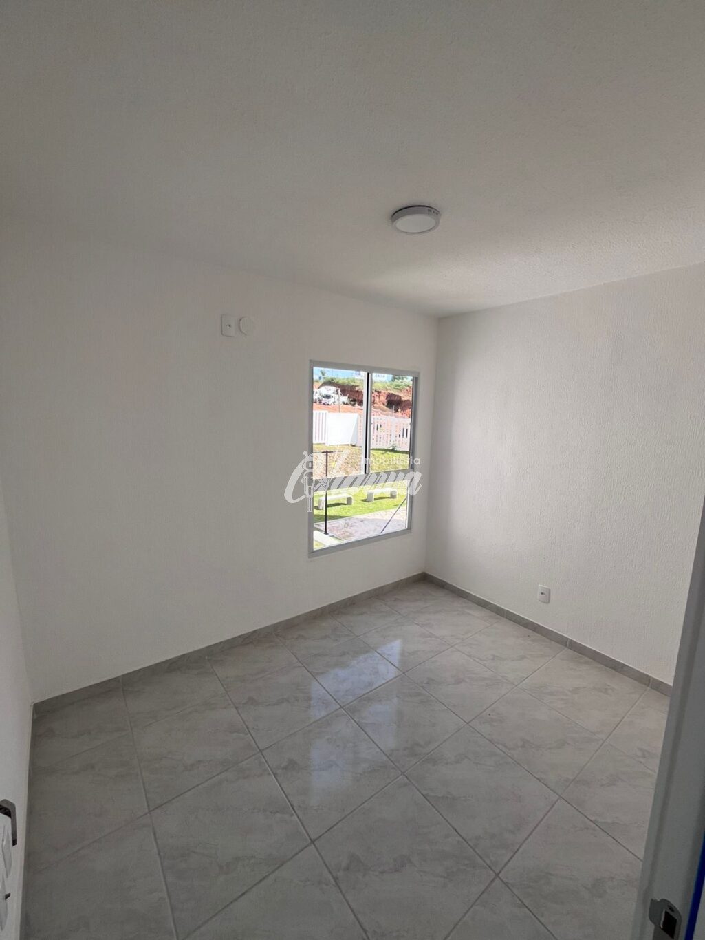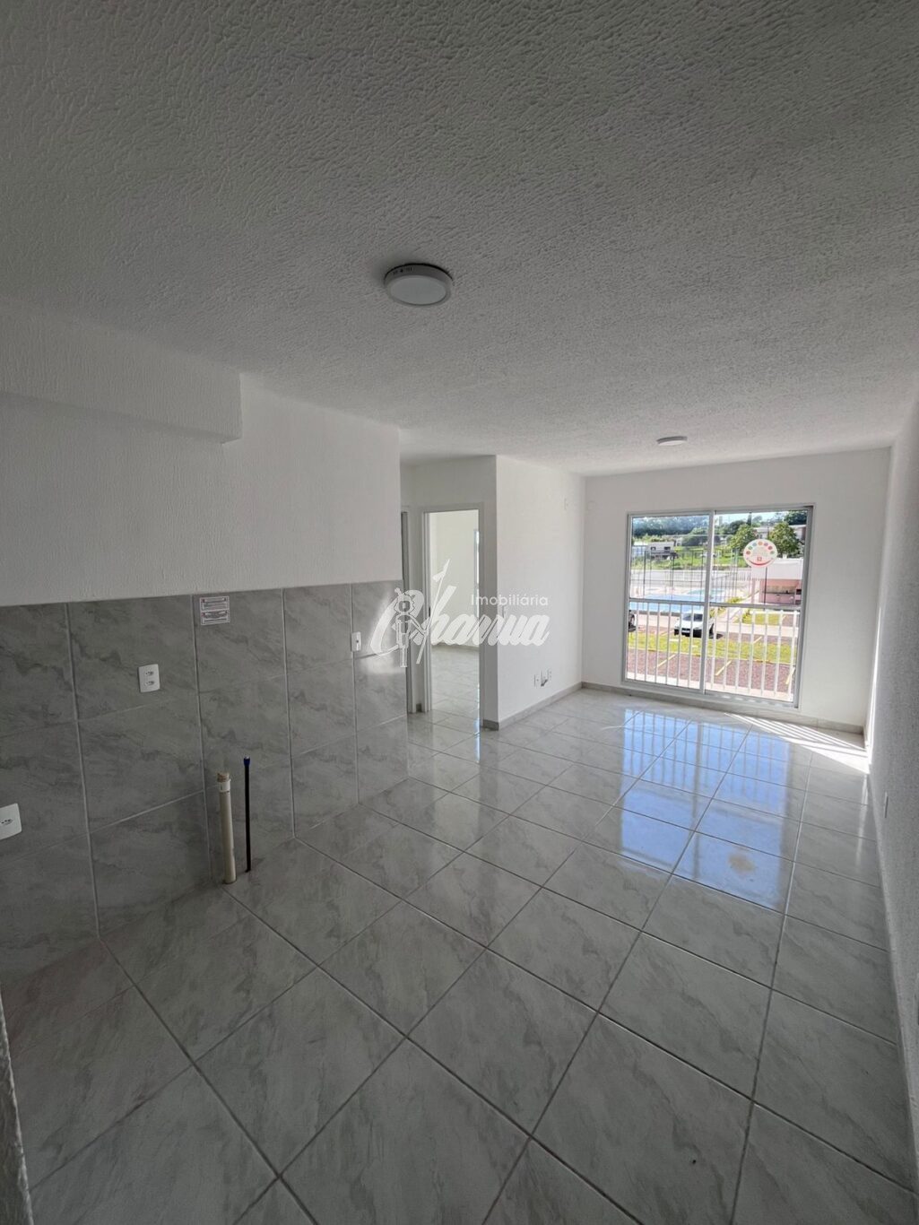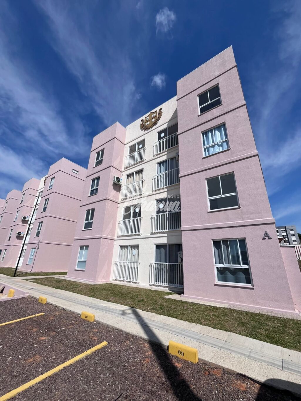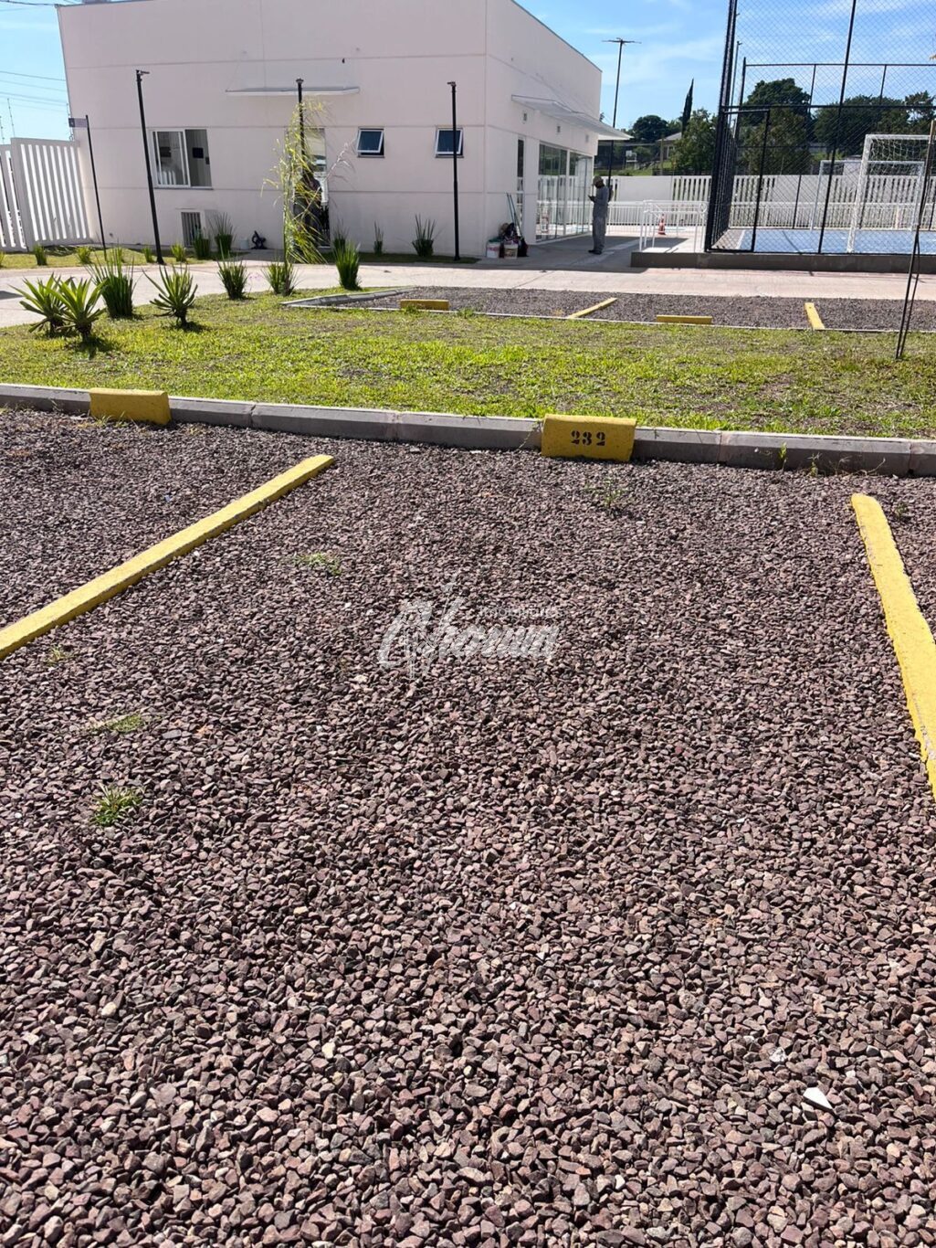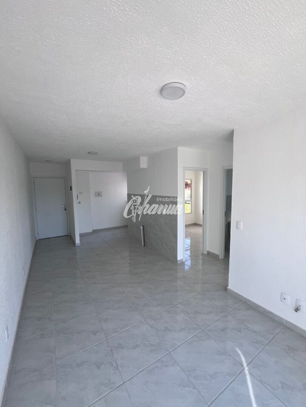 Apartamento com sala, cozinha, dois dormitórios, banheiro, área de serviço e vaga de estacionamento.