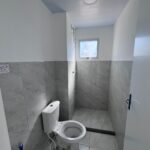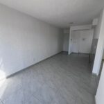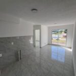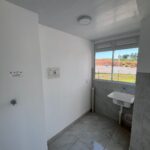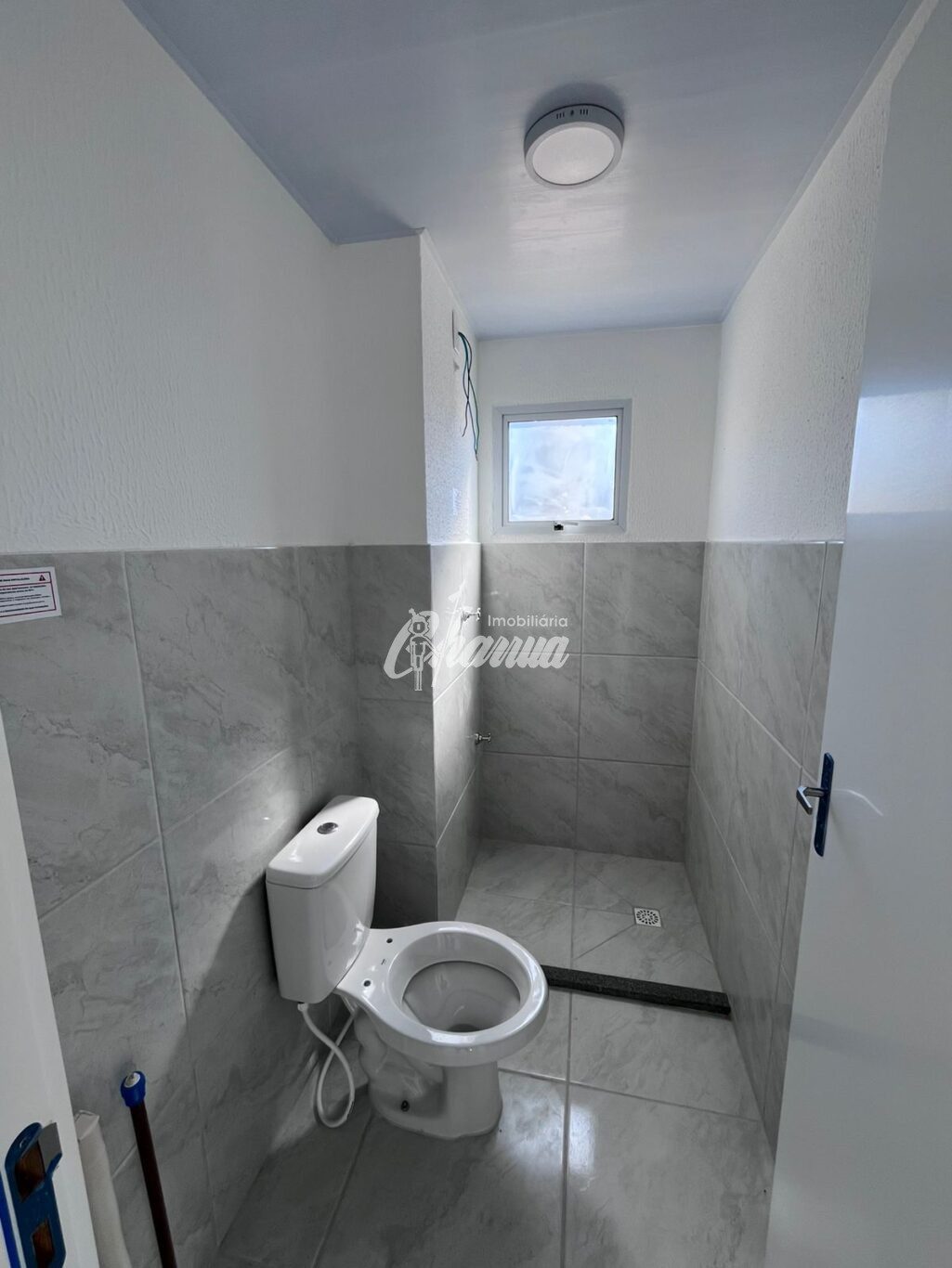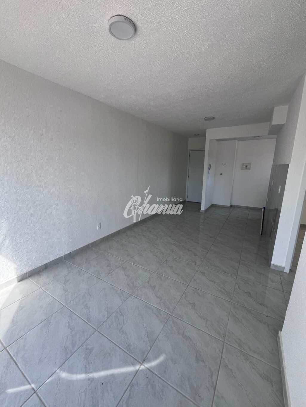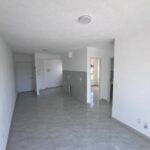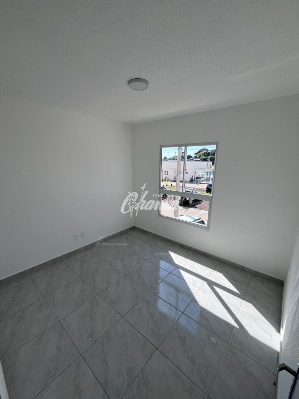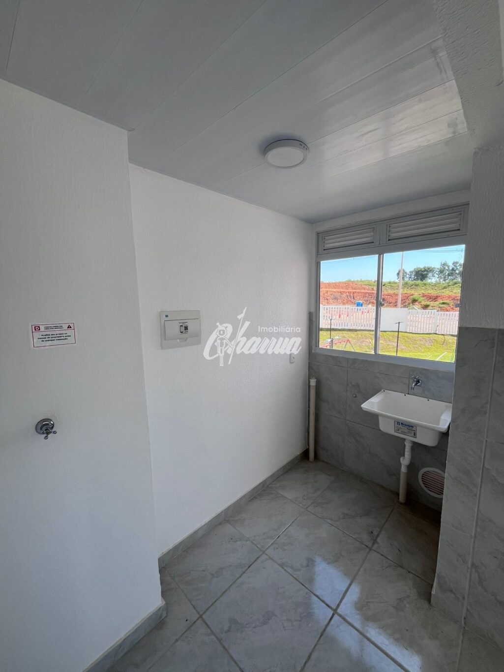 Apartamento com sala, cozinha, dois dormitórios, banheiro, área de serviço e vaga de estacionamento.
