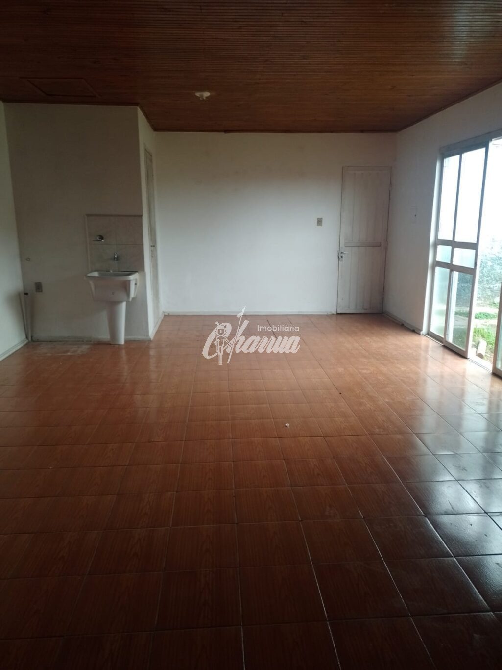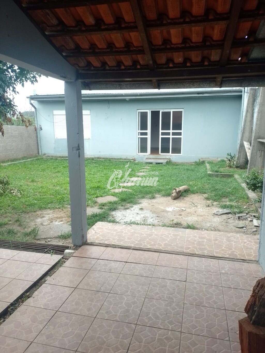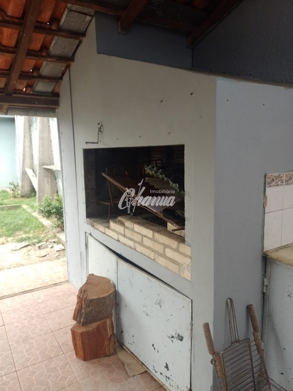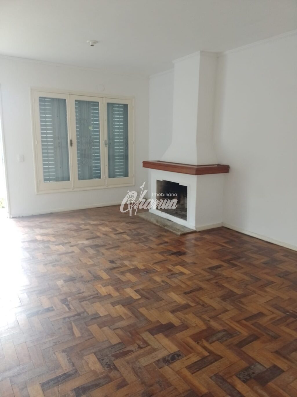 Casa com sala com lareira, três dormitórios, sendo um suíte, banheiro social, cozinha, salão de festas com banheiro e subsolo, garagem com churrasqueira e pátio.