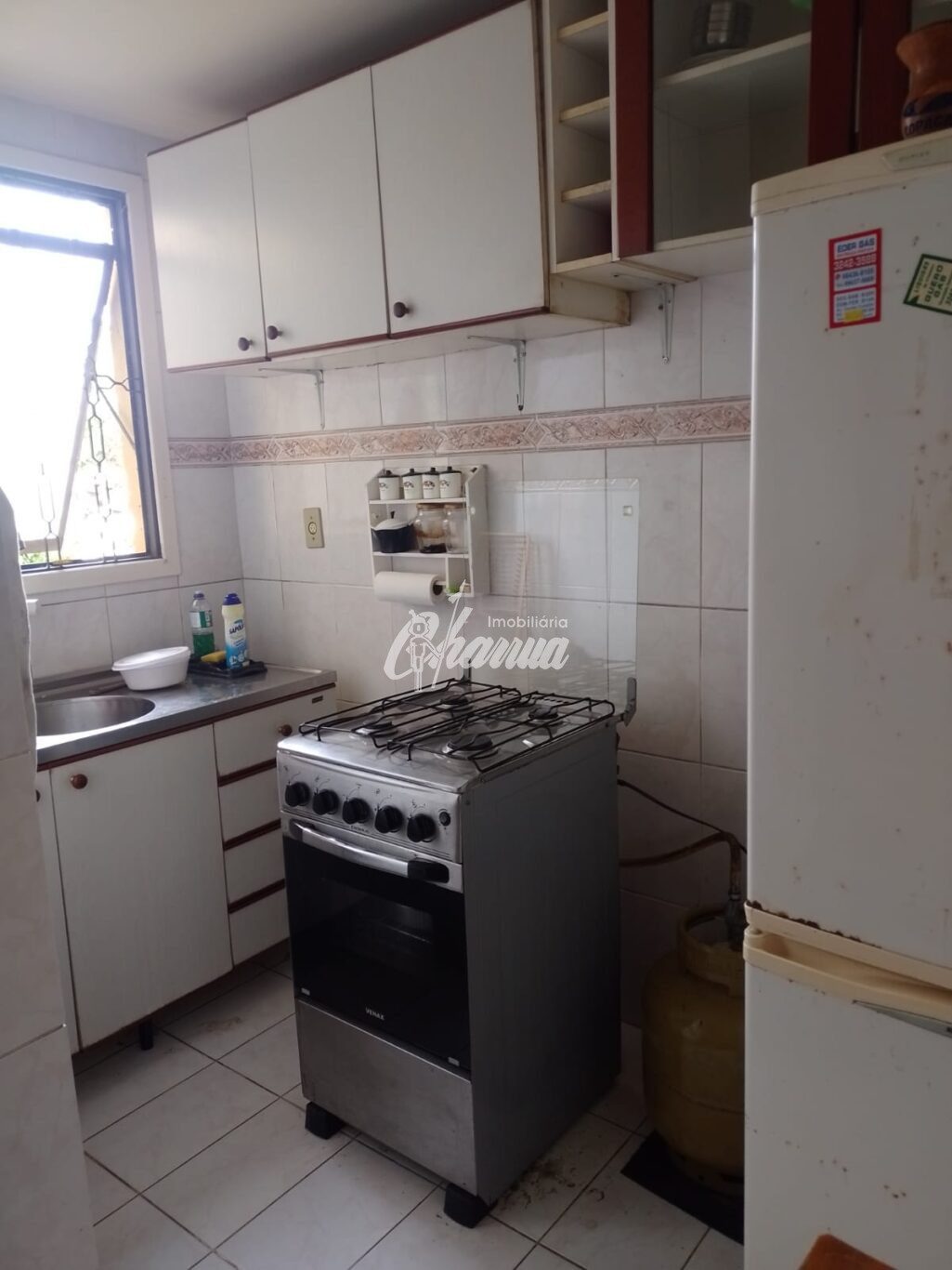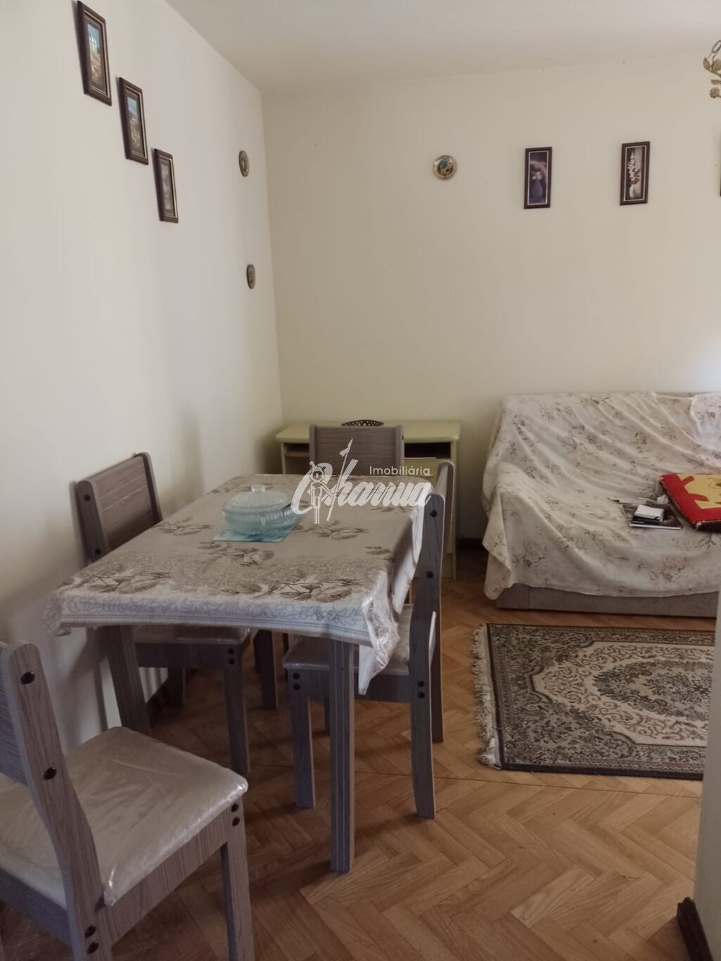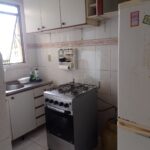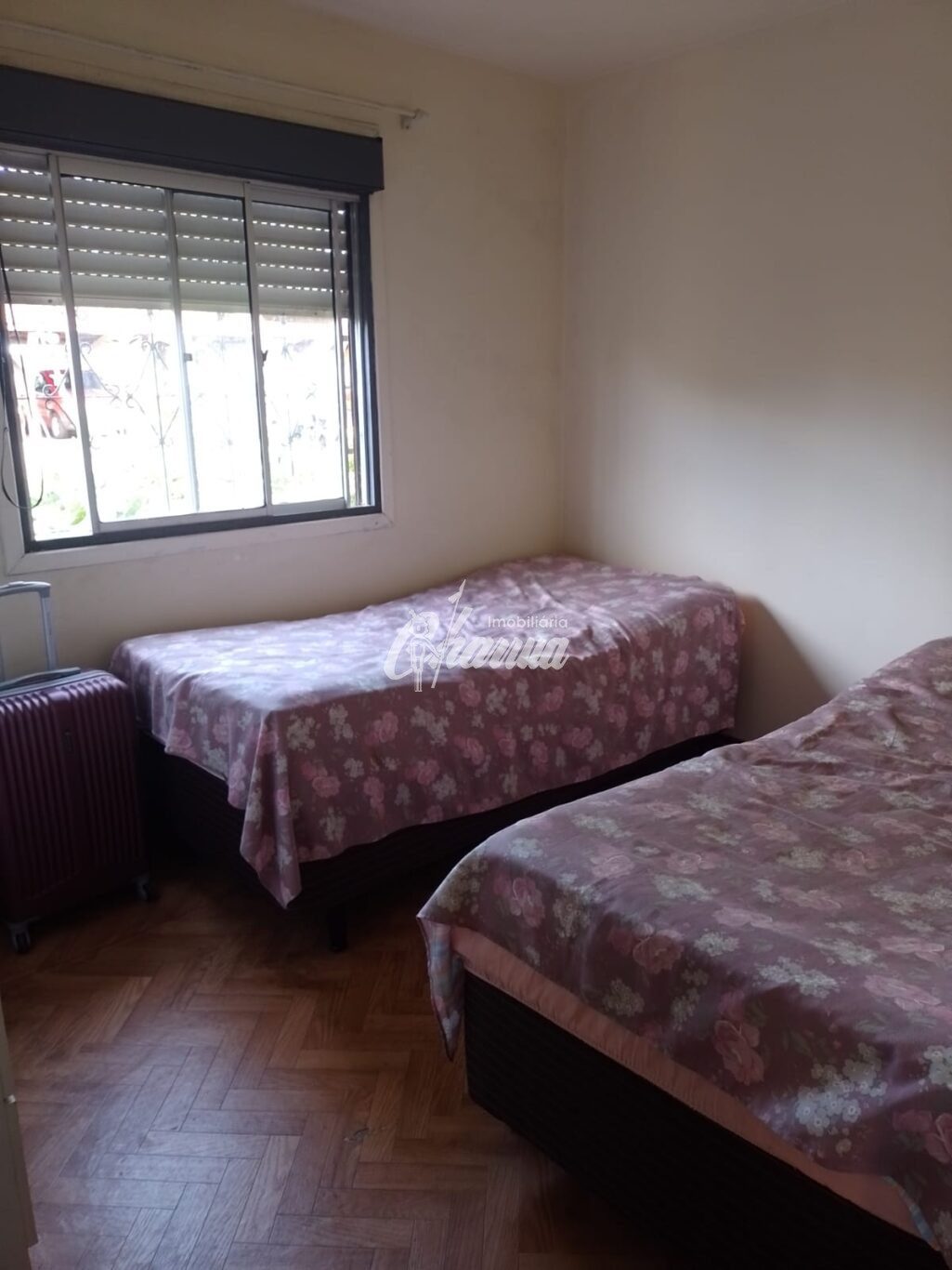 Apartamento com sala, dois dormitórios, banheiro, cozinha, área de serviço e box para carro.